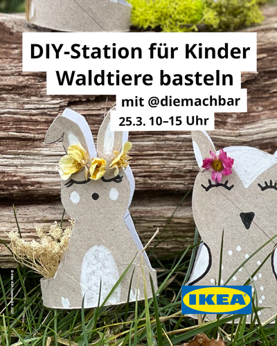 Das Team von @diemachbar zeigt dir, wie du Papprollen in Waldtiere verwandelst. Dich erwartet ein großer Basteltisch voll mit Stiften, Naturmaterialien und einer Menge Spaß. Komm einfach vorbei und mach mit! Und für alle, die sich lieber selbst in ein Waldtier verwandeln wollen, gibt es Waldtiermasken die selbst angemalt werden dürfen.
